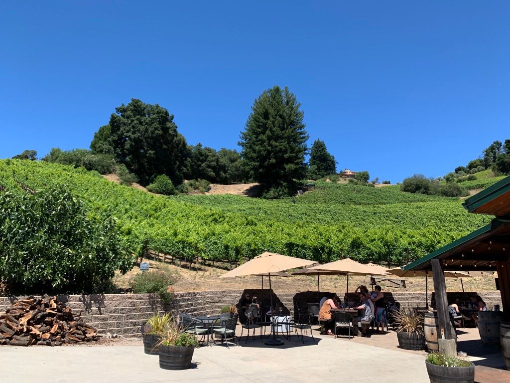 The vineyard’s tasting room is quite laid back. We’re told that we can sit wherever we want. We decide to sit outside to enjoy the beauty of the vineyard that is directly in front of us. The patio has a few bistro-style tables, picnic tables and even a lounge area with a couch. One thing is for sure, there are no terrible tables, as the views of the vineyard and redwoods are out of this world no matter where you are sitting. Hana, our tasting hostess, likes to think of the vineyard tasting room as a “tasting experience.” She prides herself in making people who come to the vineyard feel like part of the Big Basin family.