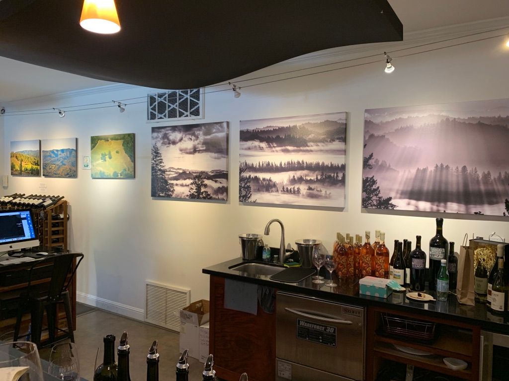 The downtown tasting room is a bit more bustling, yet still easygoing. As you walk up to the tasting bar, the friendly staff greets you. Along the back of the bar hangs black and white photographs of the fog that engulfs their vineyard each morning. After just coming from the vineyard, the photographs don’t do the redwoods justice. A slide show of their vineyard plays on a television toward the right of the bar. The scenes include harvesting the grapes, aerial views of the vineyard and the vineyard tasting room itself. The downtown tasting room has a few tables, both inside and out, where you can sit back, relax and enjoy your wine.