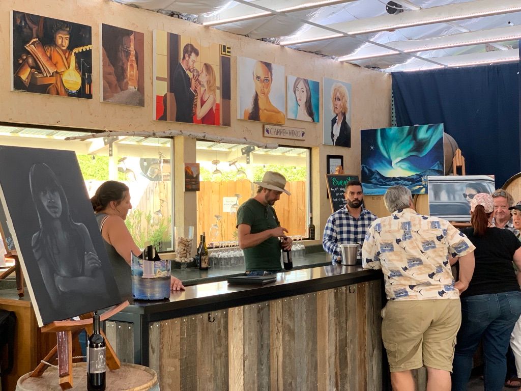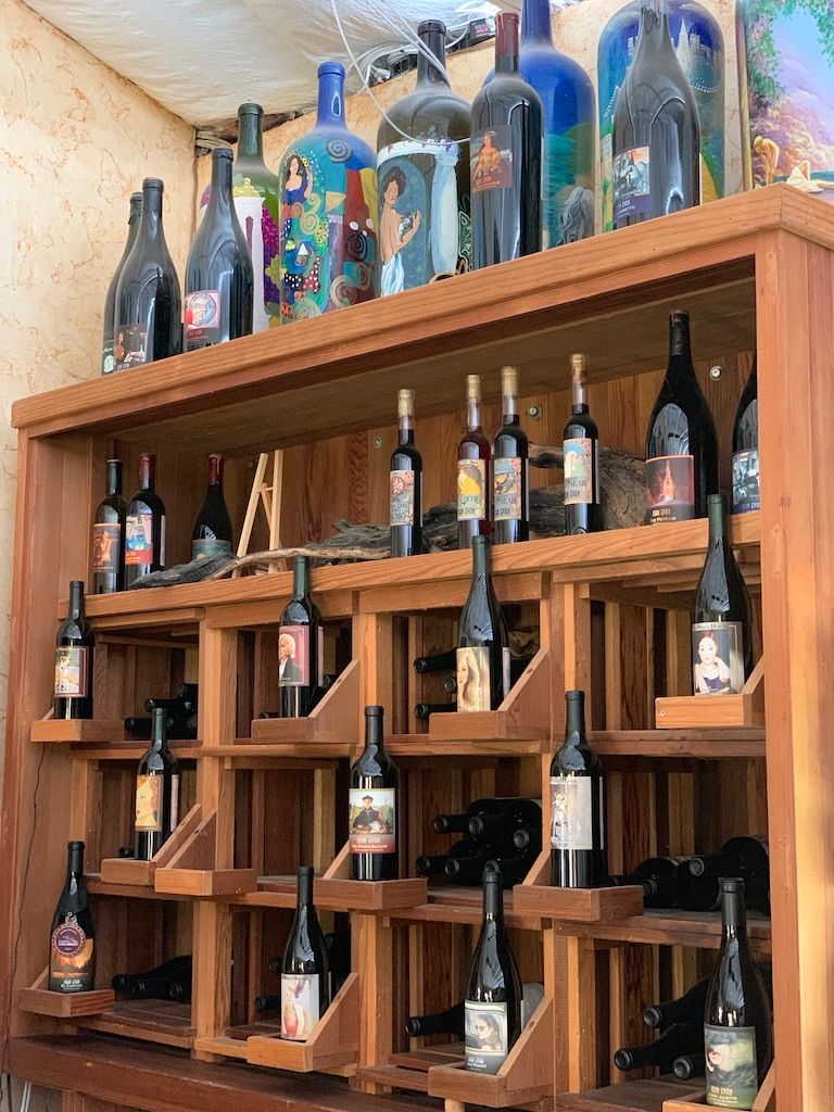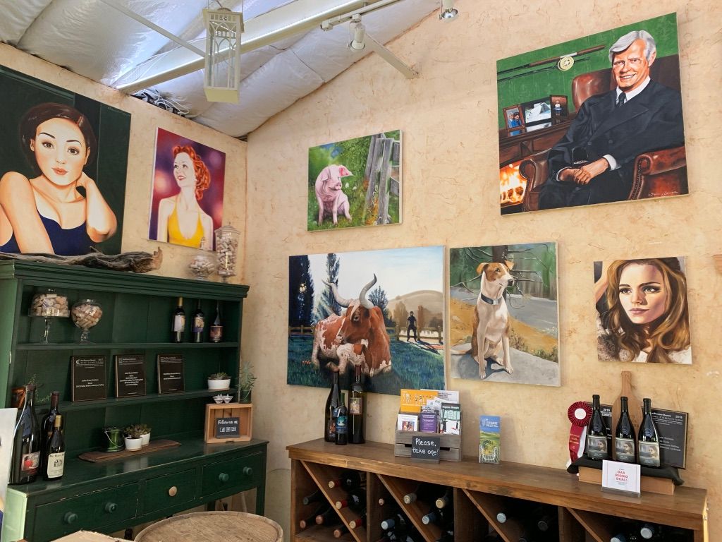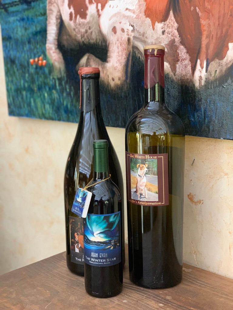 John Evans sister, Laura Marion, is an extremely talented artist. The tasting room also serves as an art gallery filled with Laura Marion’s work, from canvases for sale to personal pieces, like John’s doggo. Her artwork is also found on the labels of both John Evans and Big White House wine bottles.