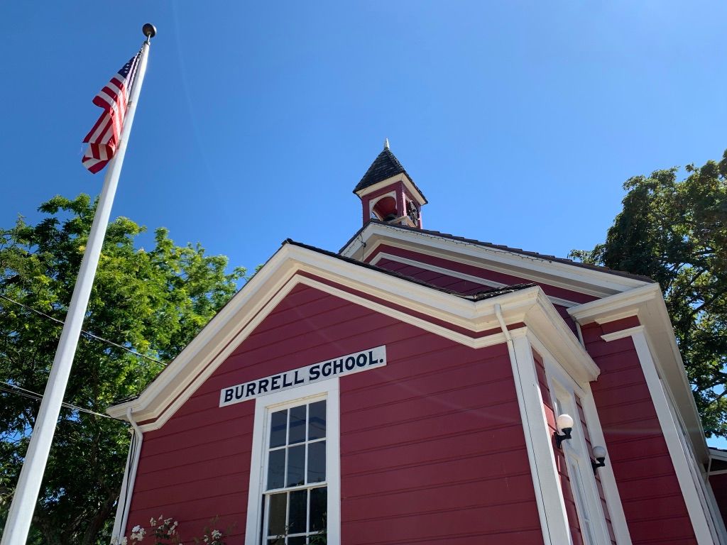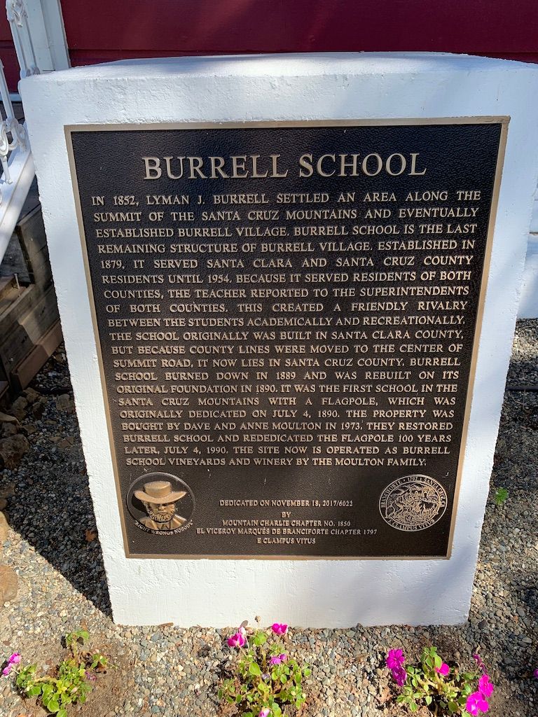 Cuties, we made it! On a warm Saturday afternoon we finally arrive at Burrell School. Walking towards the tasting room, we pass by the original schoolhouse. We see a plaque featuring the history of Burrell School. The schoolhouse is the last remaining structure of the old Burrell Village, which was founded by Lyman J. Burrell in 1852. The school had residents from both Santa Clara and Santa Cruz Counties as students, which created a friendly rivalry between the counties at local events.