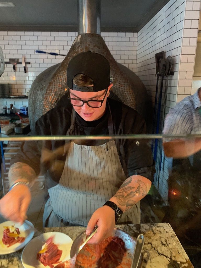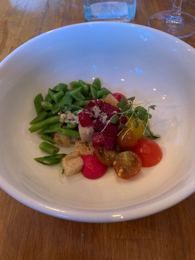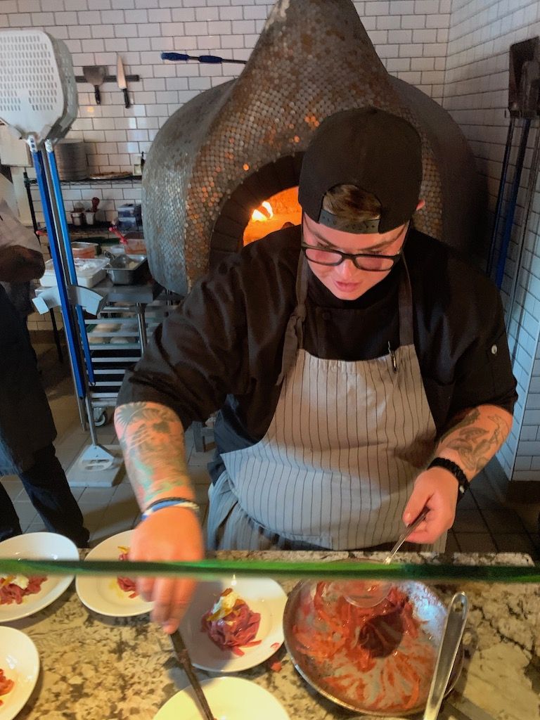 The next two courses were the Hand-Cut Pasta and Sourdough Panzanella, both paired with cider, a 2016 Isastegi Sargardo Naturala from Tolosa, Spain. The pasta was by far my favorite dish of the night. The simplicity of the pasta was delicious. My mouth waters thinking about the poppy seeds elevating the texture of this dish. One thing I know for sure is, “more please!”