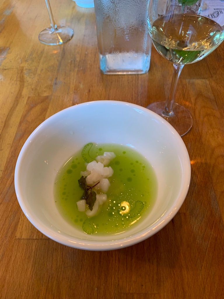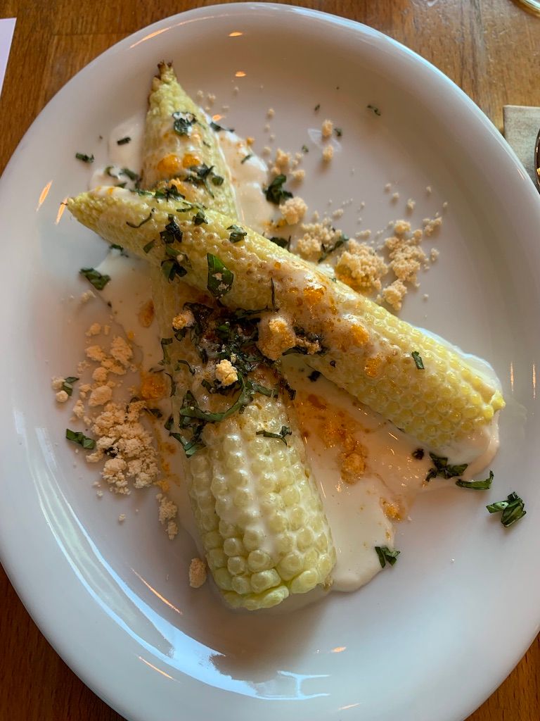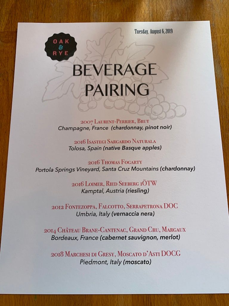 The first two courses of the night are Italian Street Corn Ribs [Ed. note: full menu reproduced below.] and Cucumber-Melon Gazpacho, both paired with a 2007 Laurent-Perrier, Brut. As we begin the second course, the sommelier explains the wine pairing. We ask about the first course, as the champagne did not pair all that well with the corn ribs. She explains that they decided to use the same wine for the first two courses. A second wine would pair with courses three and four. After that, the wine would come rapidly, one glass per course.
