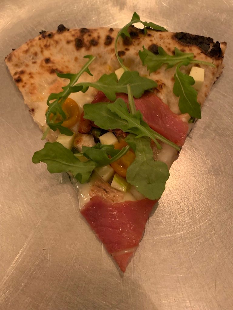 The next two courses are Cheese Arancini paired with a 2016 Thomas Fogarty chardonnay and 24 Hour Pork Belly paired with a 2016 Loimer, Ried Seeberg riesling. A Pizza Slice follows, paired with a 2012 Fontezoppa, Falcotto, Serrapetrona DOC. This is the first time I’ve ever had a Serrapetrona. It complemented the cherry tomato and basil in the pizza. Yum!