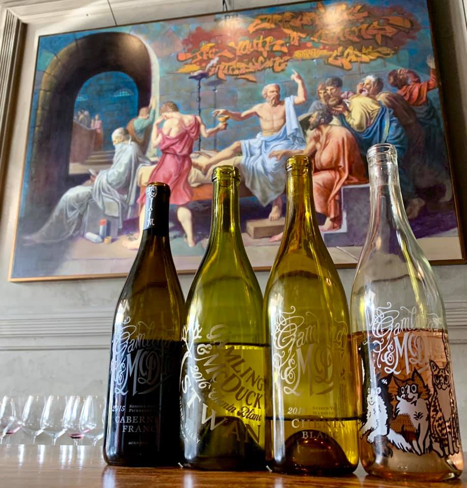 Gamling and McDuck is super fun! When you walk in, make sure you look up! They have a fiberoptic “constellation” on their ceiling. On the wall, behind the bar, they have a unique take on the The Death of Socrates. After you grab a glass of wine, make sure you walk down past the bar to find the story of how Gamling met her McDuck and started their wine adventure.