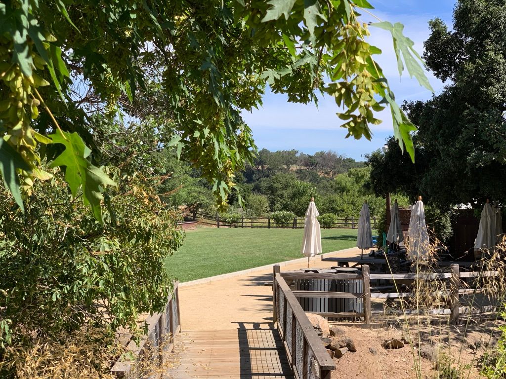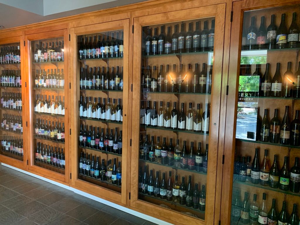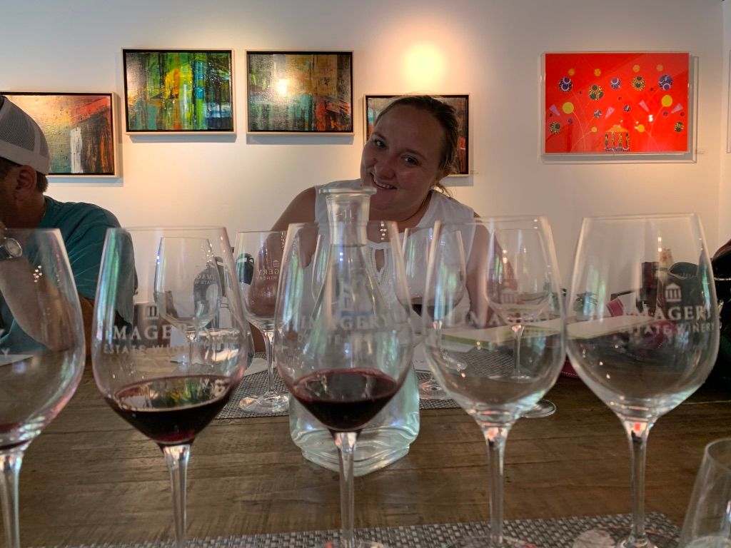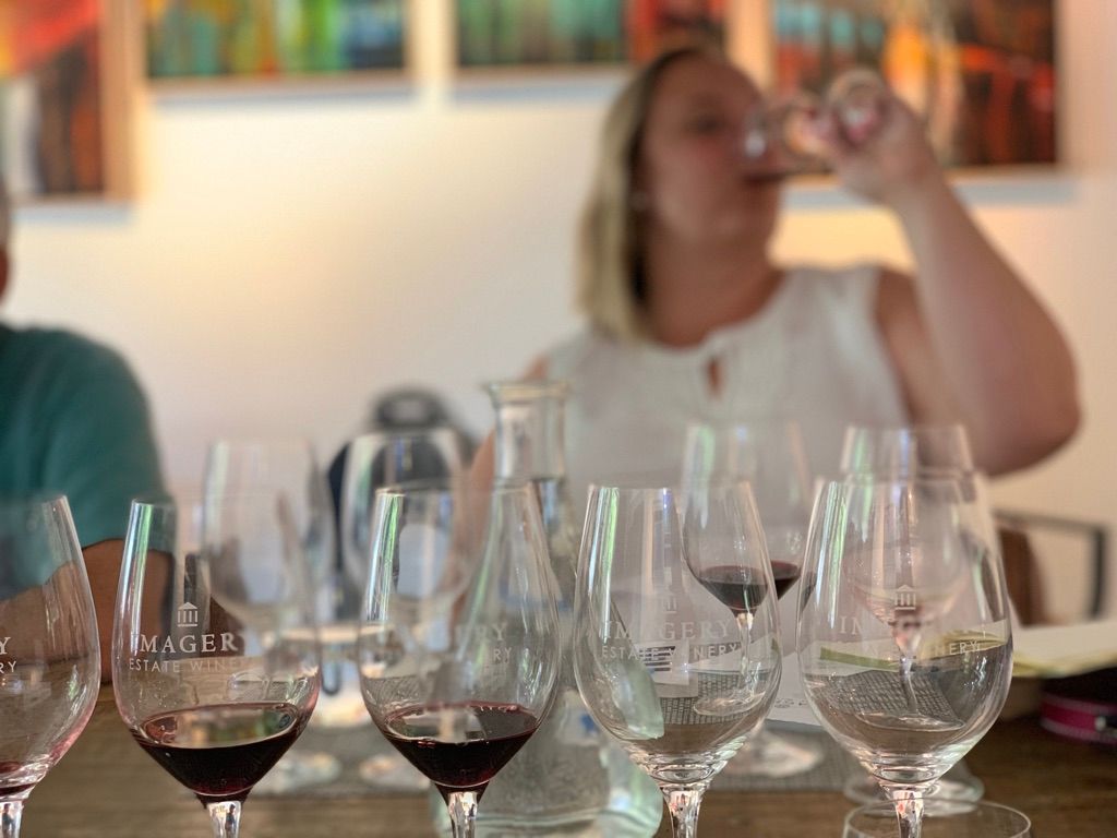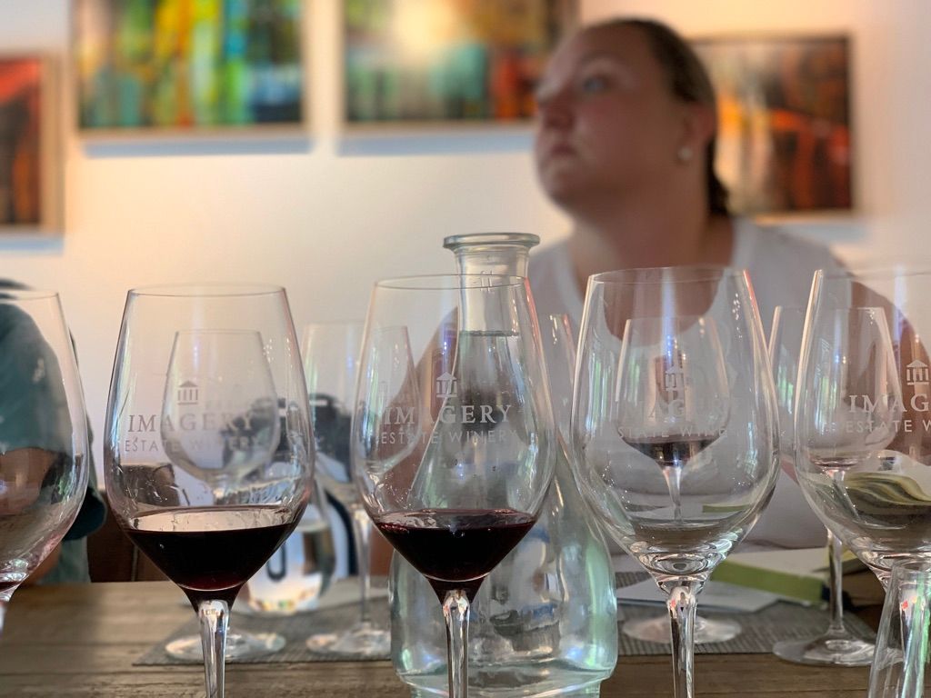 The room has a large dining room table in it with a view of their back patio. There is also art on the walls that Imagery has commissioned. They’ve commissioned over 500 artworks by over 300 different artists. The artwork is reproduced on the labels of their wine bottles. After the tasting, we learn that if you become a Club Avant-Garde member, you are invited to their auction, where you can buy one-of-a-kind art from various Imagery artists.