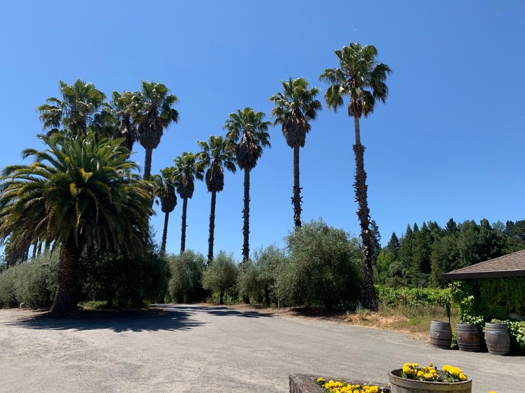 As we arrive at Iron Horse’s driveway, we notice that palm trees line both sides of the entrance, just like at Scribe Winery. We park and walk over towards the tasting room.