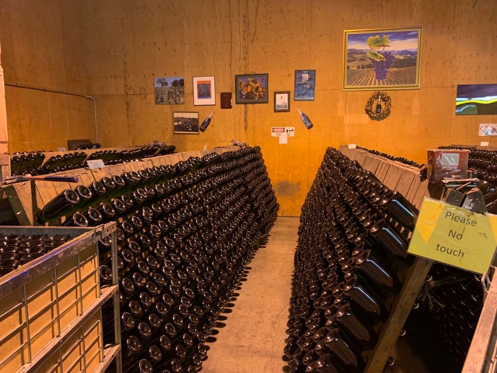 The next wine is the 2014 Wedding Cuvee. This sparkling wine was first produced for the 1982 vintage, to be served at their daughter, Joy’s, wedding. Wine in hand, we trot down a hill on the way to their cellar room, where the grapes become sparkling wine! It was so fascinating to see how sparkling wine is made. We saw bottles lay aging, while Kate explained–with show-and-tell–how the dosage is added to create the bubbles as well as how the final bottles are corked. However, in my opinion, that wasn’t the coolest part of their wine cellar.