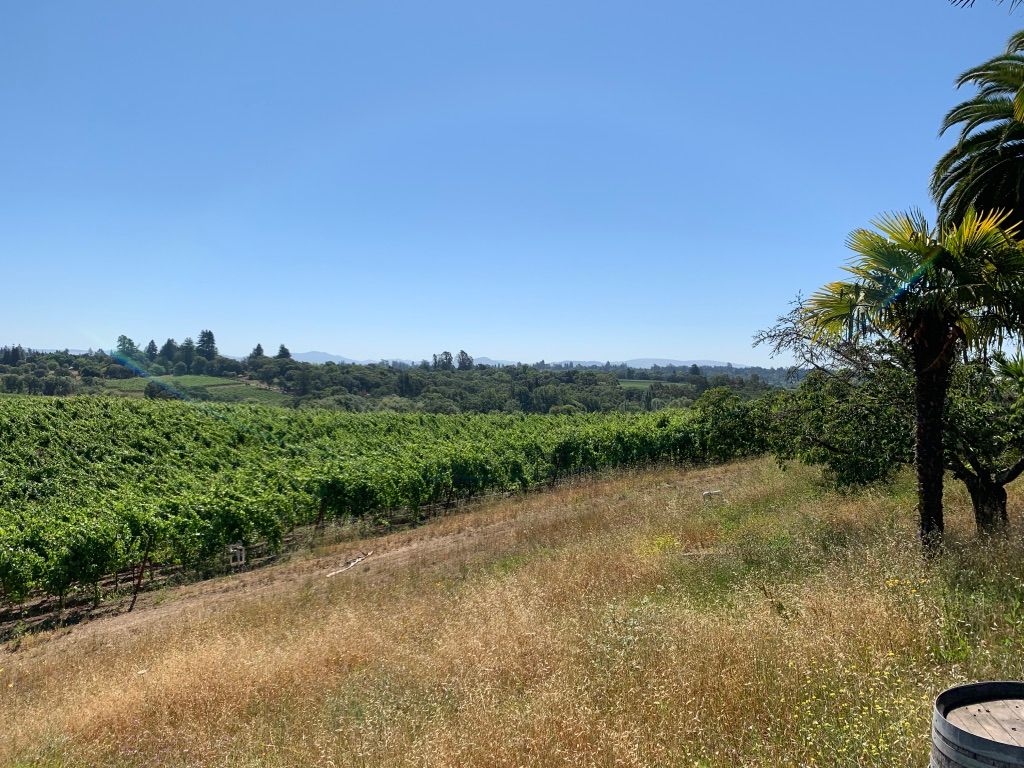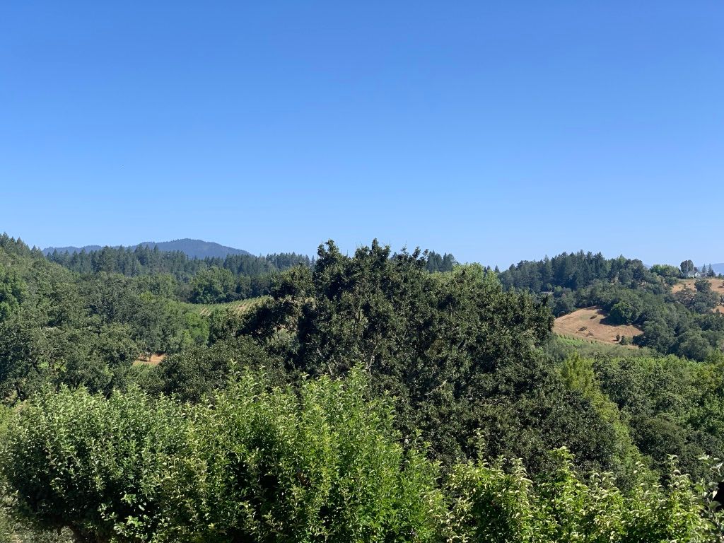 We turn around from the tasting bar and enjoy the view of the gorgeous vineyard and countryside beyond. We can see Mount Saint Helena in the distance. On occasion, it is possible to see geysers, but we are not so lucky.