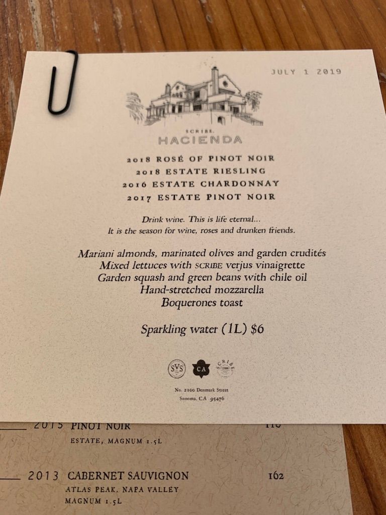 Our tasting hostess greets us and describes the history of Scribe as she pours our first wine, the 2018 Rosé of Pinot Noir. We learn that the winery itself has been around since before Prohibition. The original owners were from Germany, and before Prohibition, they grew mostly German grapes. In fact, their long driveway is named after the original owners, Dresel.